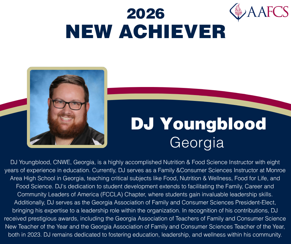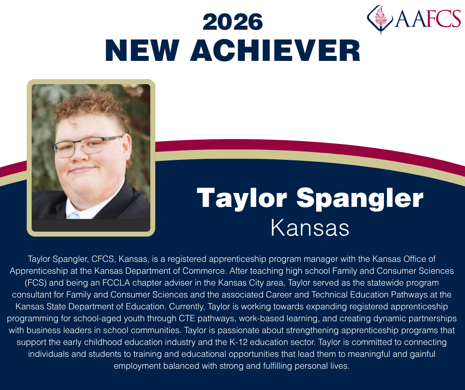 Anyone chosen to receive the New Achiever Award will receive a commemorative token which will be presented at the AAFCS Annual Conference. The recipient's name and photo will be reported in AAFCS print and online communications.