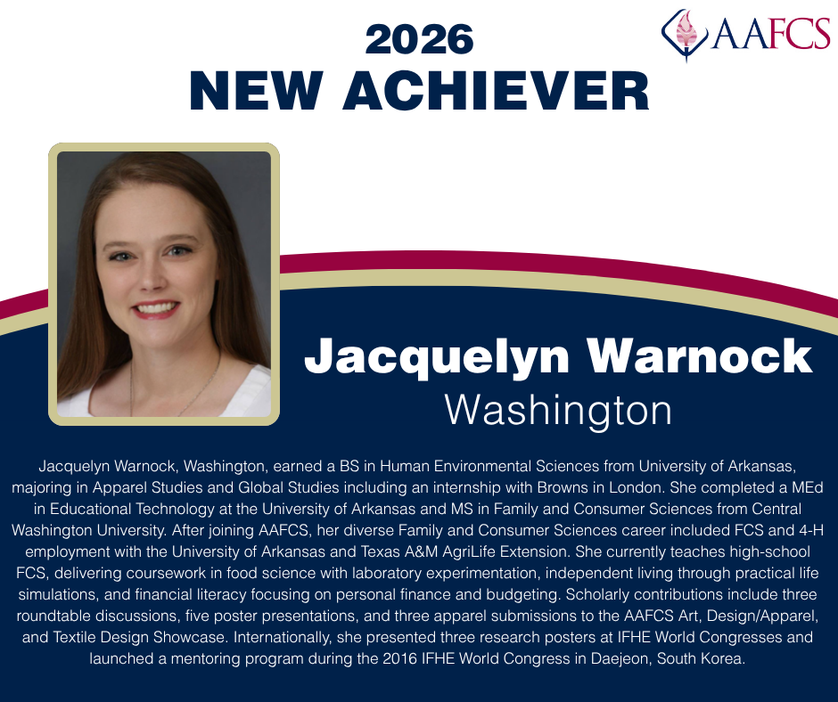 The New Achiever Award was introduced as a part of the Association’s 75th Anniversary observance in 1984 when it was established to identify and honor emerging family and consumer sciences professionals who have exhibited the potential to make significant contributions to the field through their involvement with AAFCS.