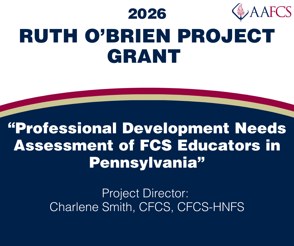 Funding is available for projects that help fulfill these objectives and are in accordance with the goals of the Association and the FCS profession.  Proposals for the Ruth O’Brien Project Grant must be innovative in nature. Proposals may be submitted for applied/action/basic research, community service, student programs, educational material development, leadership conferences, educational seminars, program model development, or other projects that contribute to the knowledge base of developments in FCS.